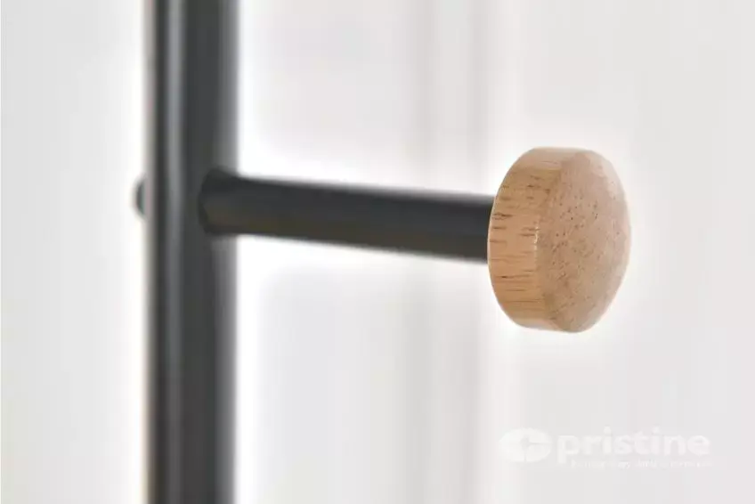 Изготовлена из металла и дерева с чёрным порошковым покрытием, имеет четыре боковых крючка для шляп, сумок, шарфов и боковую перекладину для одежды. Эта стильная отдельно стоящая вешалка для одежды станет отличным дополнением к любой комнате или коридору вашего дома.