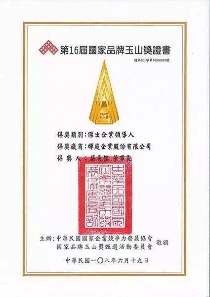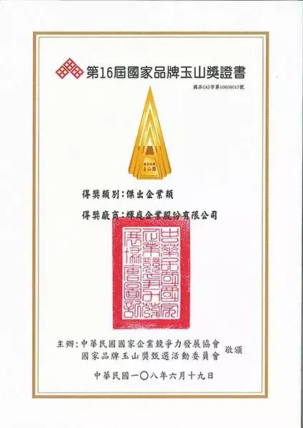 Премия «Национальный бренд Юшань» отбирает наиболее конкурентоспособные корпоративные модели, чтобы побудить тайваньские компании усердно работать и стремиться к созданию имиджа национального бренда. Благодаря управлению локализацией, качественному дизайну продукции и активному внедрению полностью автоматических процессов и управления на протяжении более 30 лет группа Huei Tyng получила две награды «Премия выдающихся бизнес-лидеров» и «Премия выдающегося предприятия».