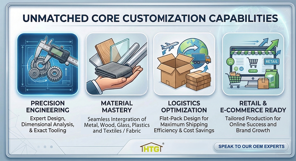 В то время как большинство поставщиков просто следуют чертежам, мы сосредотачиваемся на том, как ваш продукт функционирует. Мы сотрудничаем с вами, чтобы доработать каждую деталь, гарантируя, что он будет выделяться на полке магазина и выдержит испытание временем в доме покупателя. В Huei Tyng персонализация — это больше, чем просто эстетика; это практичное инженерное решение, повышающее долговечность и функциональность. Мы помогаем вам продавать лучше, принимая более взвешенные дизайнерские решения, и при этом контролируем ваши производственные затраты.